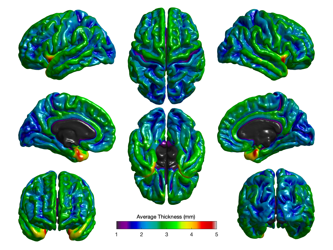palm_viewsurf(data,surfs,'layout','worsley','datarange',[1 5],'mapname','spectral','title','Average Thickness (mm)','lightning','gouraud','material','shiny');