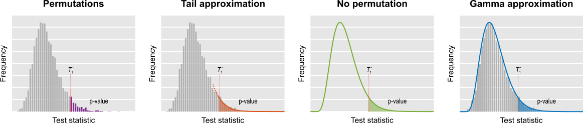 The figure below summarises the methods: With permutations (i.e., few permutations, negative binomial, and low rank matrix completion), the p-value is the fraction of the test statistics obtained after permuting that are higher than in the unpermuted. In the tail approximation, the tail of the permutation distribution is subjected to the fit of a generalised Pareto distribution (GPD), from which the p-values are computed. In the method in which no permutations are performed, the first three moments of the permutation distribution are computed from data and model, and to these which a gamma distribution is fitted, and from which the p-values are computed. In the gamma approximation, the moments of the empirical permutation distribution are used to the fit of the gamma distribution. The figure is merely illustrative: the actual fit uses the cumulative distribution function directly, such that histograms are not constructed.