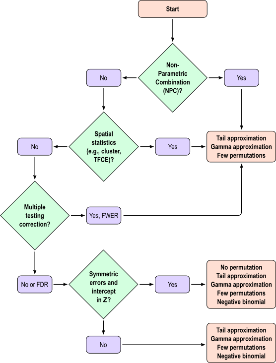 Few permutations | Compute the p-values using just a few permutations, e.g., less than a thousand. | Univariate and multivariate tests (CMV and NPC), both uncorrected and corrected (FWER and FDR). Spatial statistics available (TFCE and cluster). | -n <nperms> |