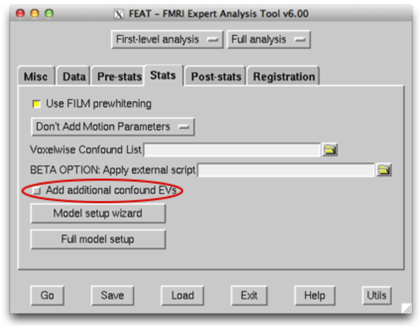 And another text file containing the time series information of ICA noise components, along with any other sources of noise that you wish to model. This file should be space delimited and should be input into the Add additional confound EVs box. The input within the Data tab should be your raw fMRI data - FEAT can then be run from scratch, including all pre-processing steps.