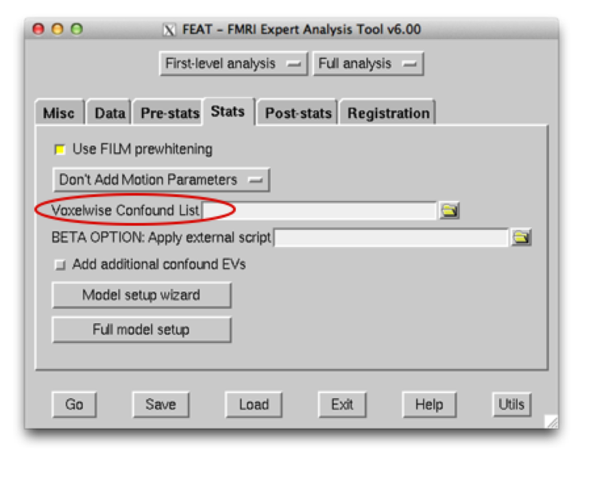 If you have carried out both PNM and ICA, you should now have two text files – one for your PNM noise output, which should be input into the Voxel Confound List in FEAT: