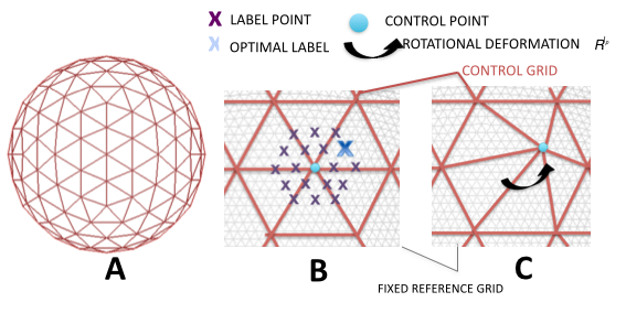 As mentioned above MSM matches two spherical surfaces known as the input and reference. Registration is performed by warping a low resolution regular Control Point (CP) Grid. At each iteration of the registration, every control point is deformed independently according to one of a small set of local rotations. The endpoints of these rotations are defined by a set of evenly spaced points (labels) that surround the control point, which are determined by placing a higher resolution Sampling Grid over each CP. This warp is then propagated to the (higher resolution) input mesh using mesh interpolation.