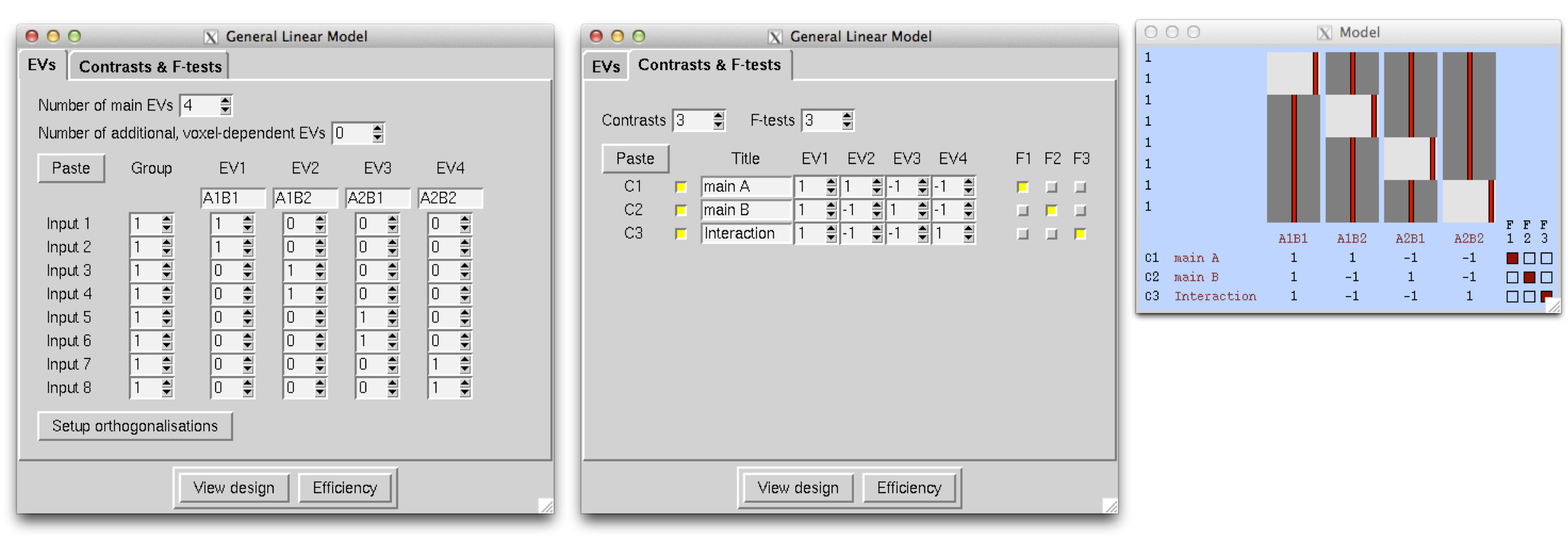 - Enter the data for your design matrix, contrasts, or F-tests, using your data-editing tool of choice (e.g. Microsoft Excel, Google docs, Emacs+org-mode, Notepad).
